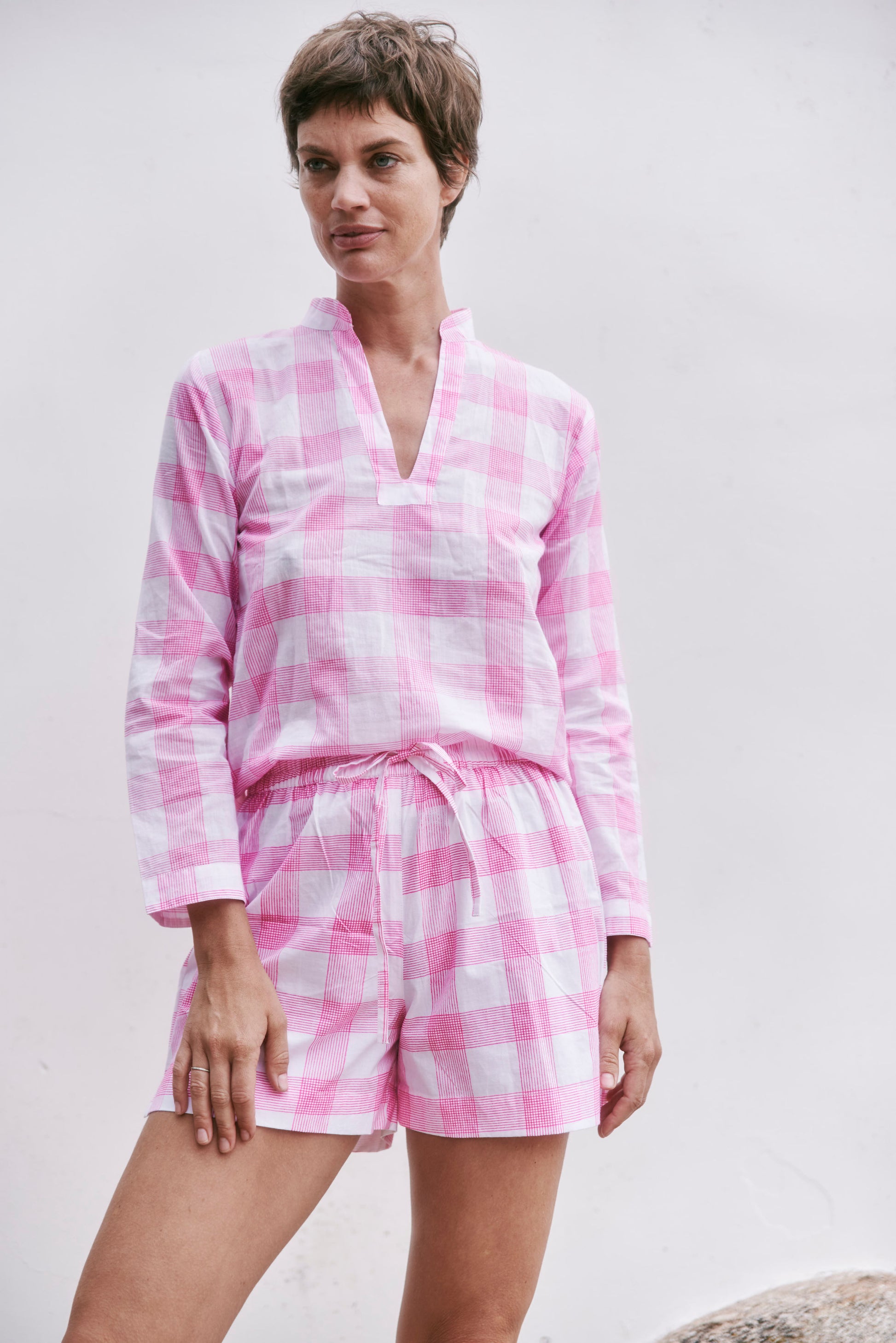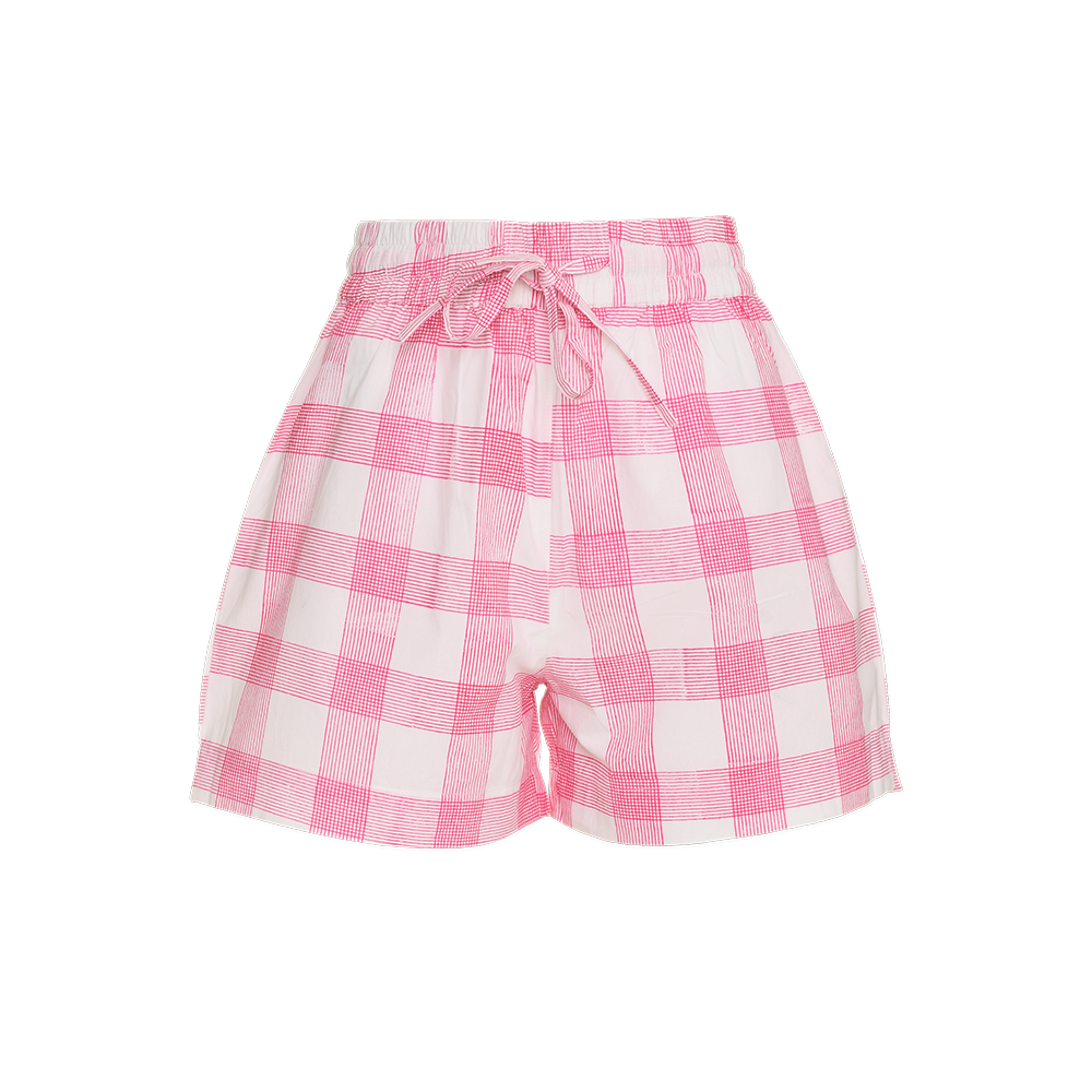 A pull-on short with an elastic waist and drawstring tie. Easy flowing leg with a hem that falls to the mid-thigh.