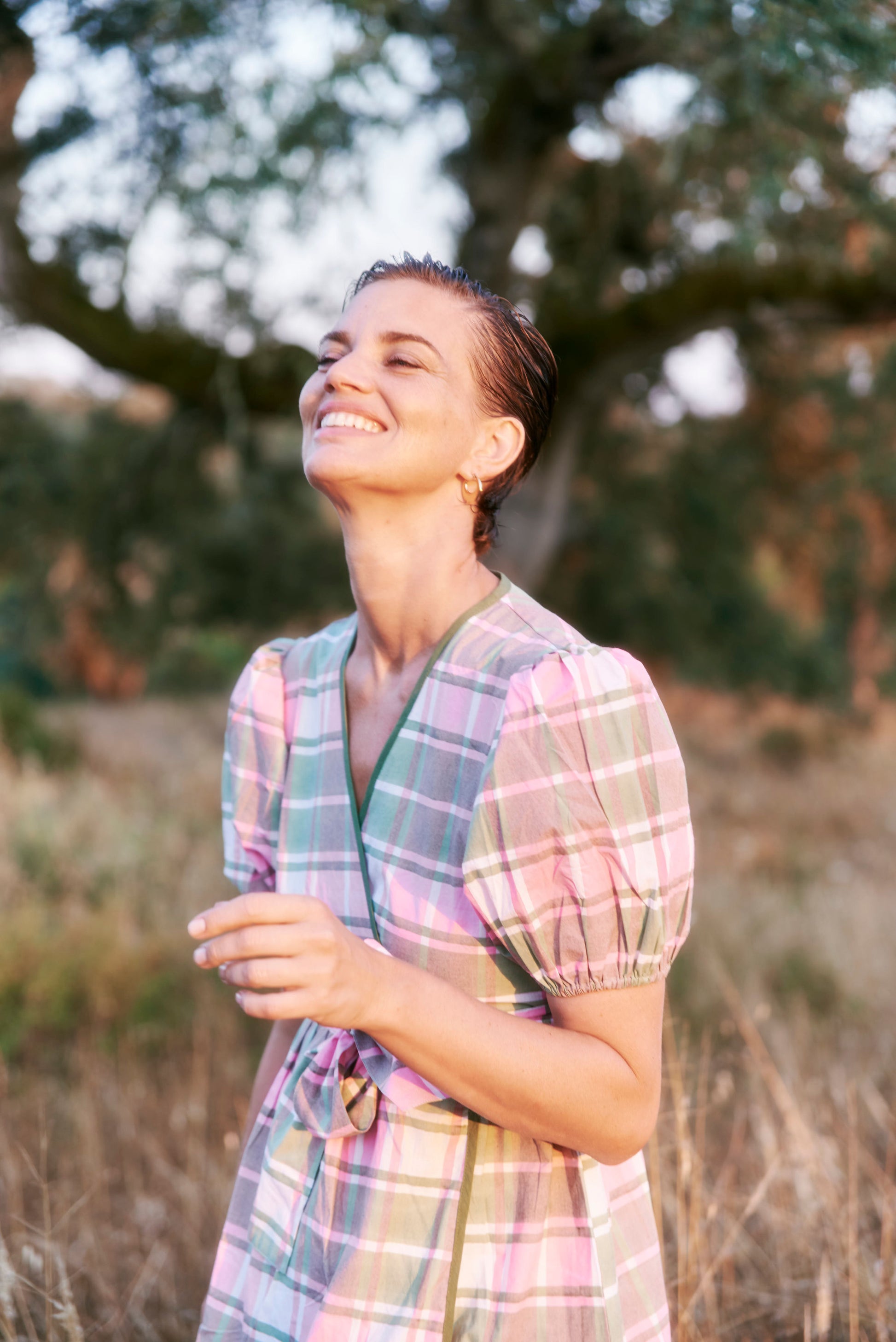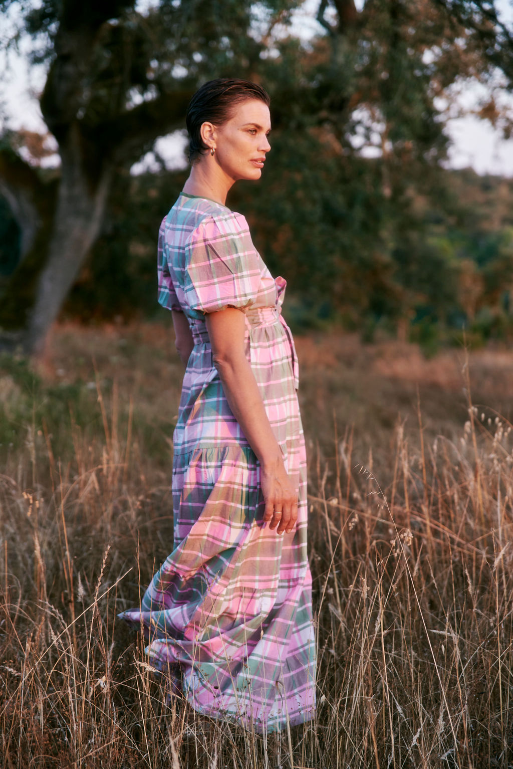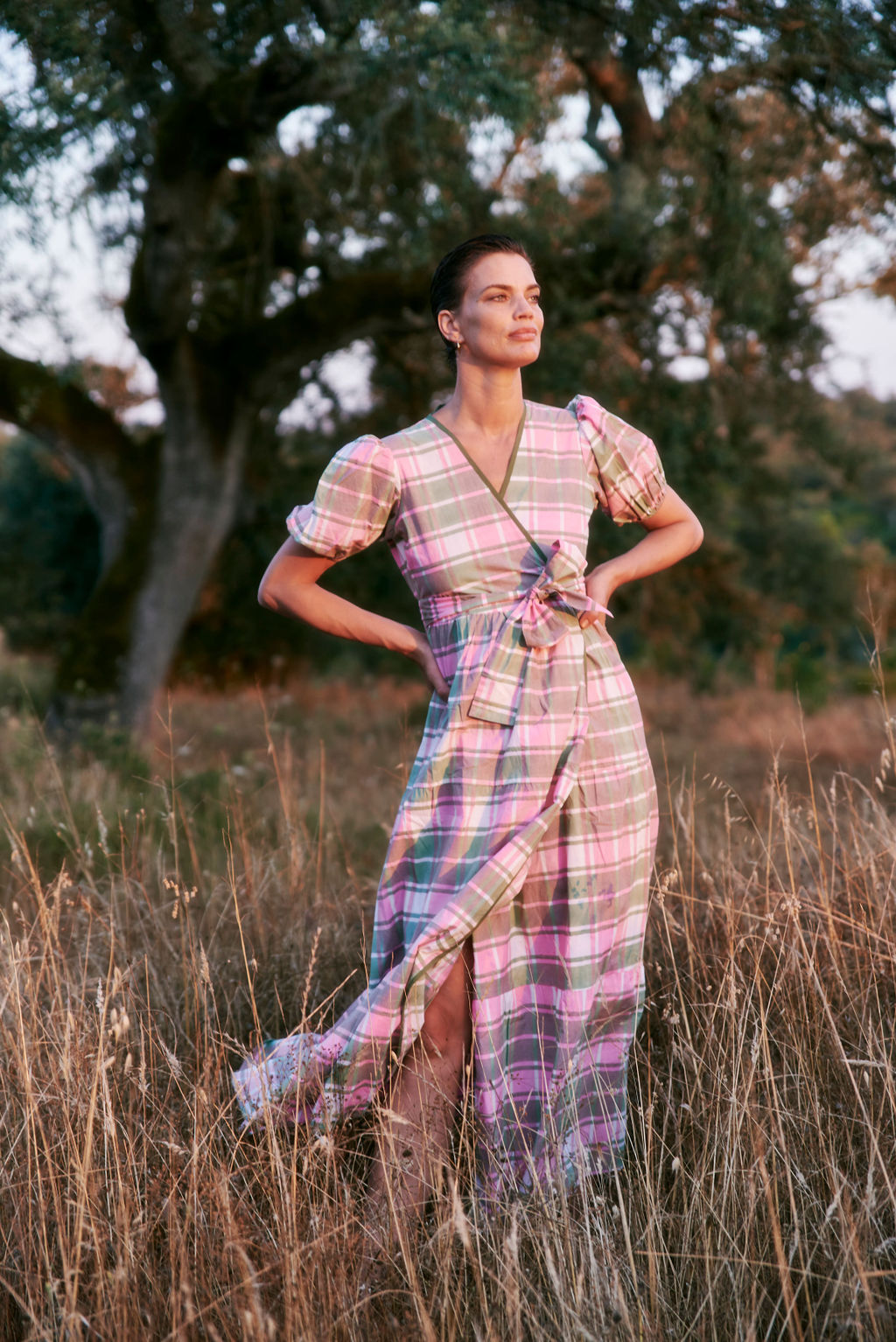 New this season, the Emily Dress is a long wrap dress with full gathered short sleeves to match her full skirt.