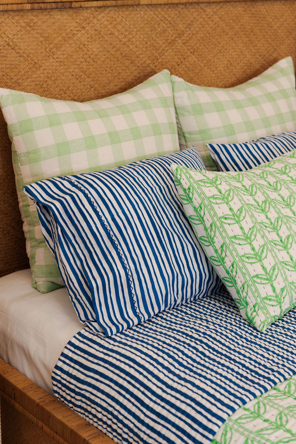 A set of two cotton pillow cases finished with hand stitched embroidery to echo the stitching on our unique quilts and shams. Made with an envelope closure for ease.