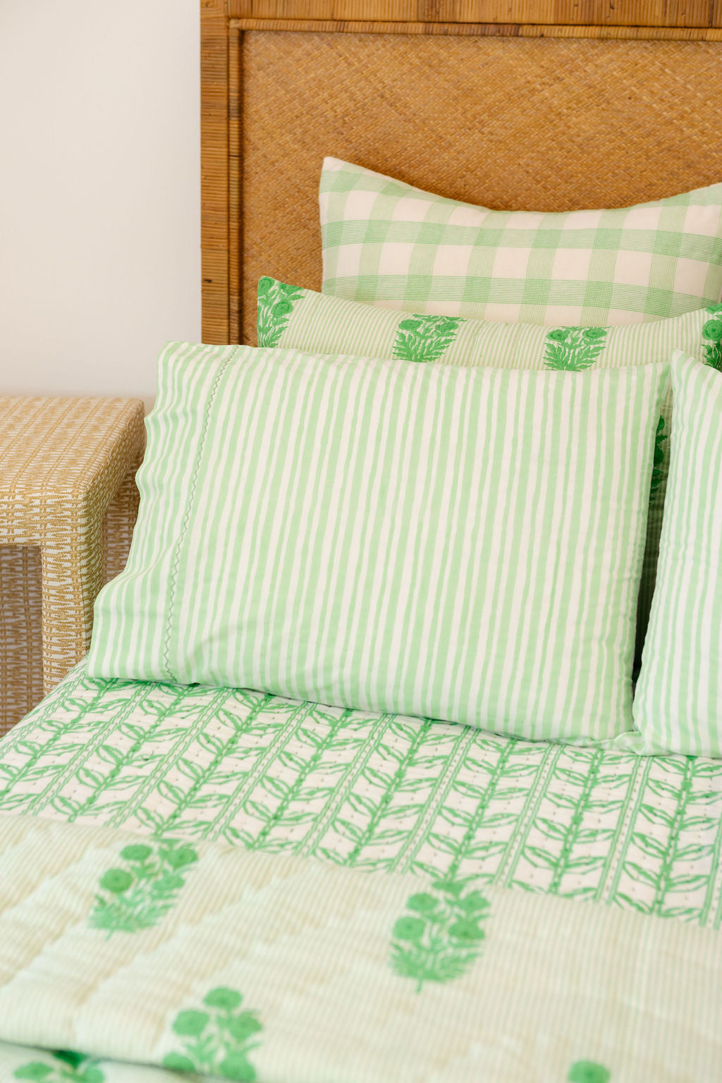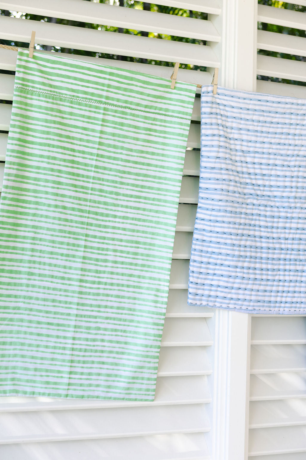 A set of two cotton pillow cases finished with hand stitched embroidery to echo the stitching on our unique quilts and shams. Made with an envelope closure for ease.
