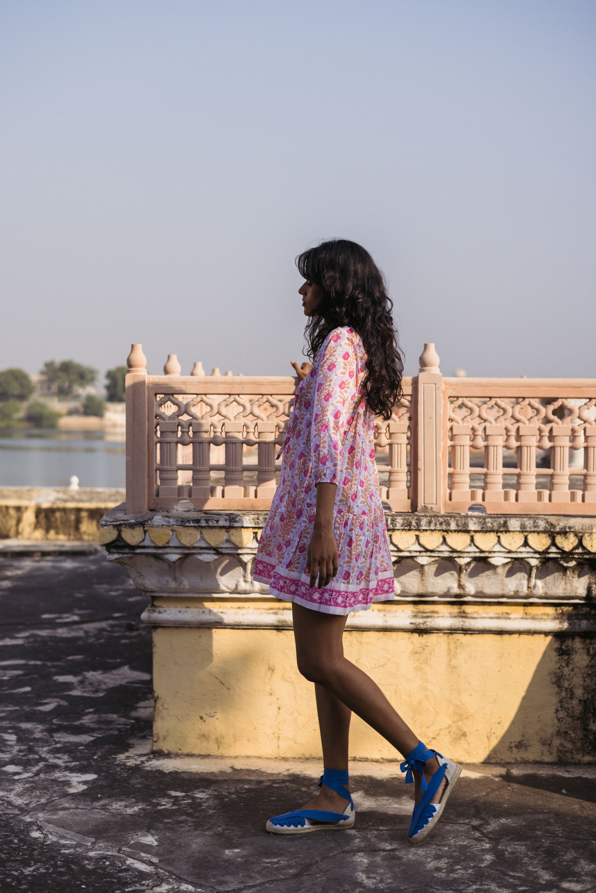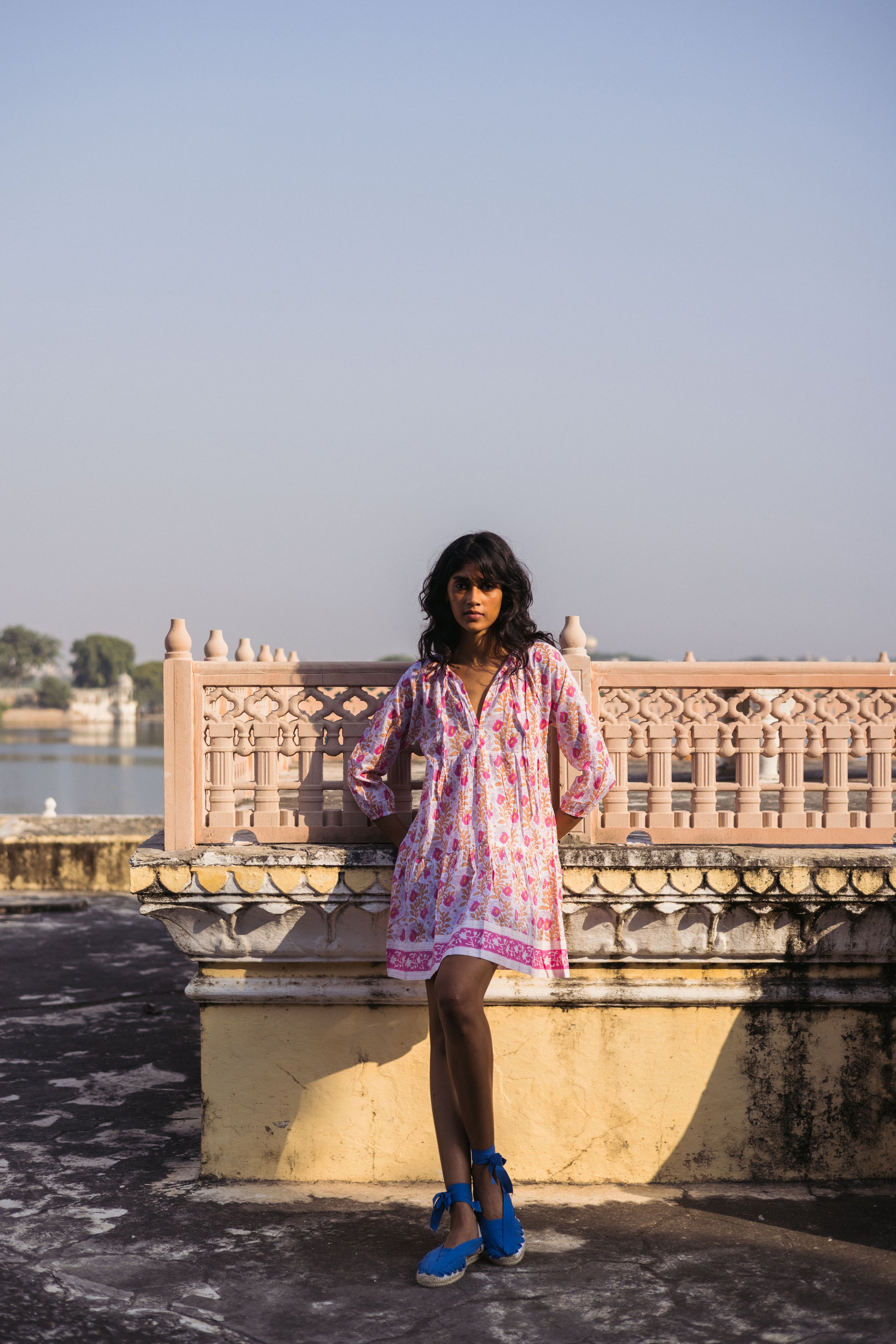 The Priya Dress, with loose sleeves and a dropped waist, has an easy, voluminous shape that lends itself to a relaxed aesthetic.