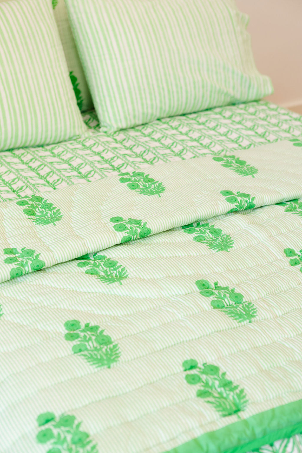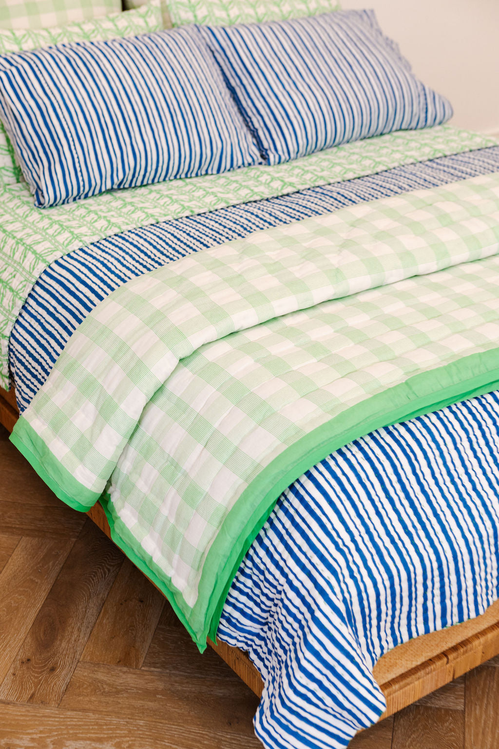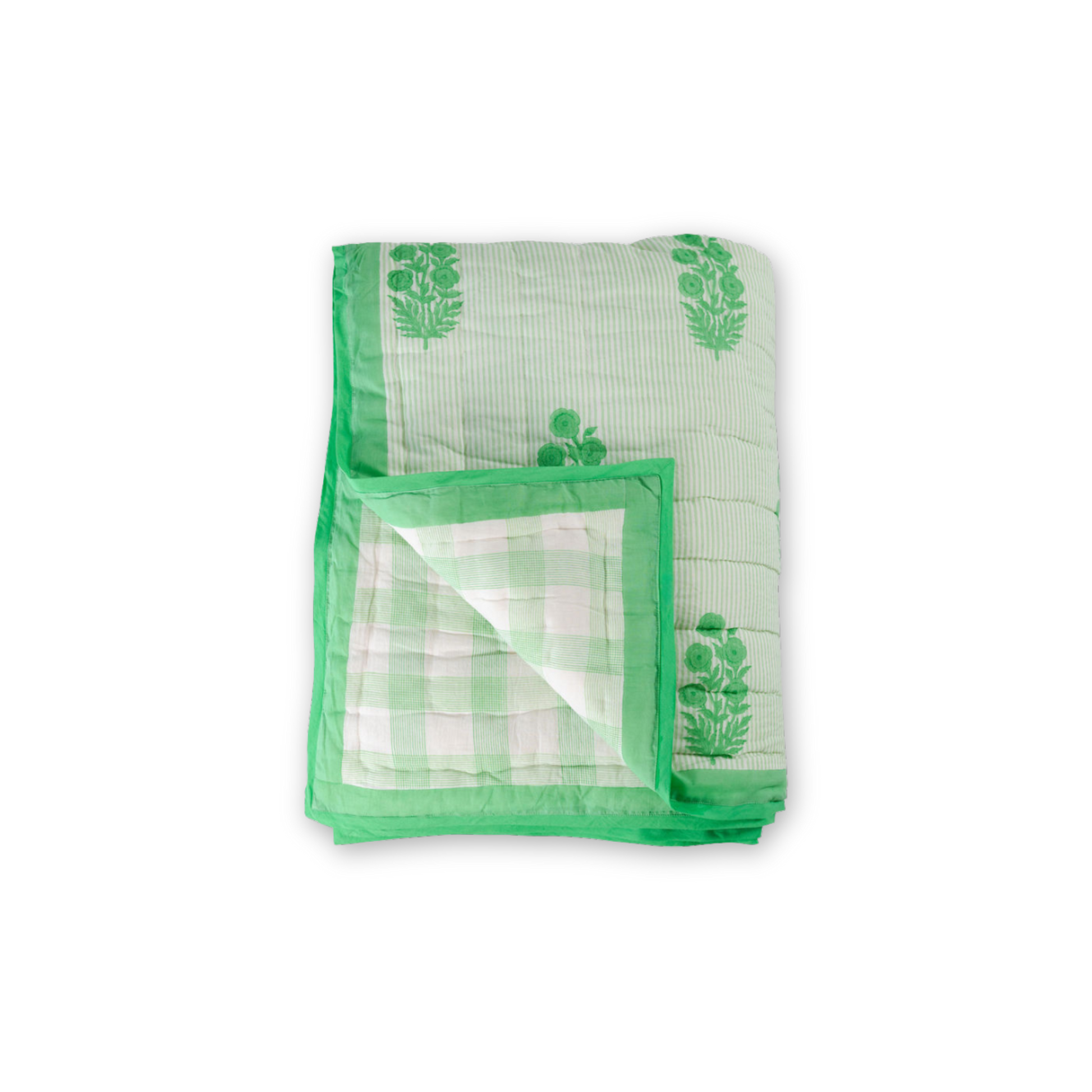 The Razai Quilt, a speciality of the desert states of India, were designed to keep individuals cool in summer and warm in winter. Our modern day version is adapted with a single layer of cotton padding held in place by tiny stitches to mimic the movement of the sand.