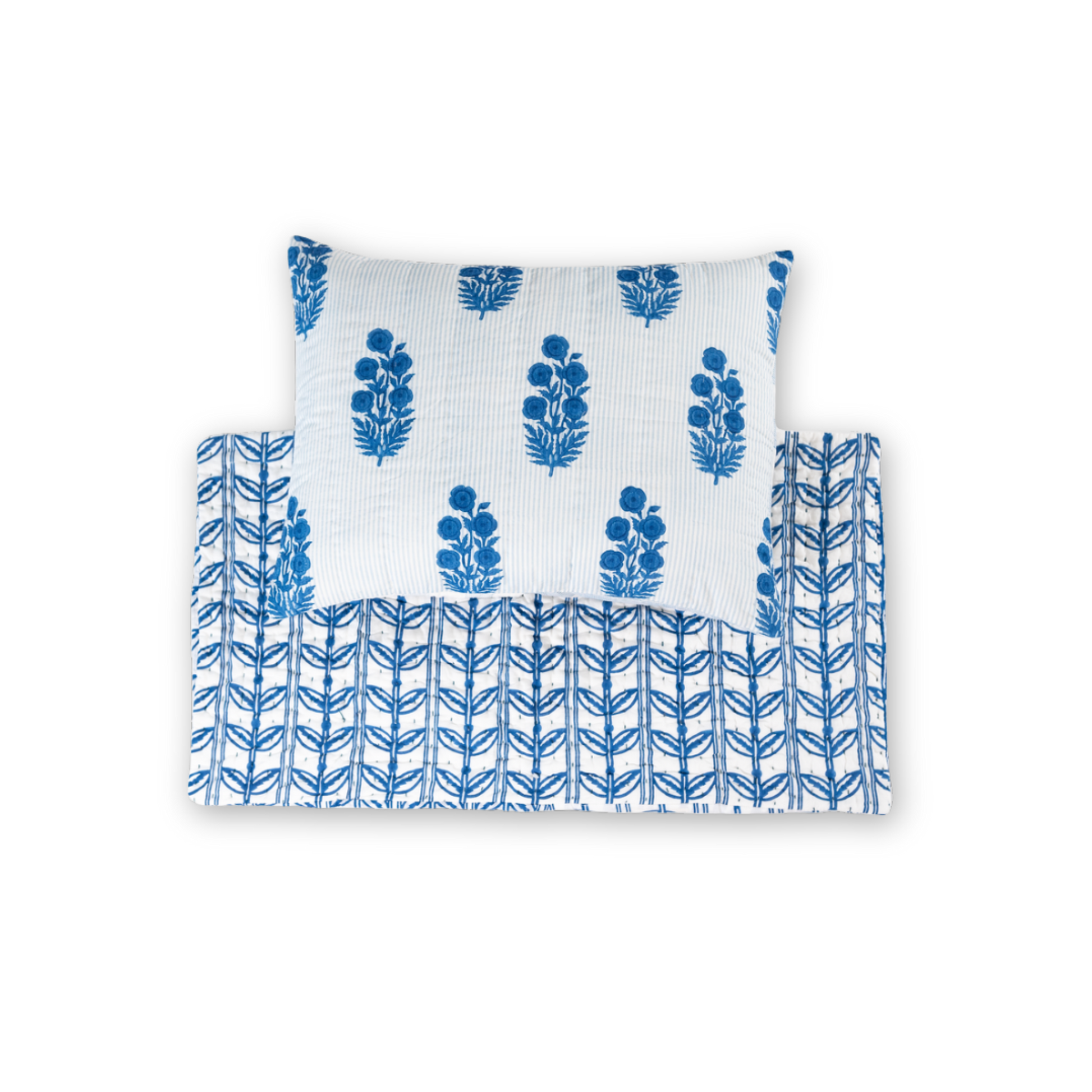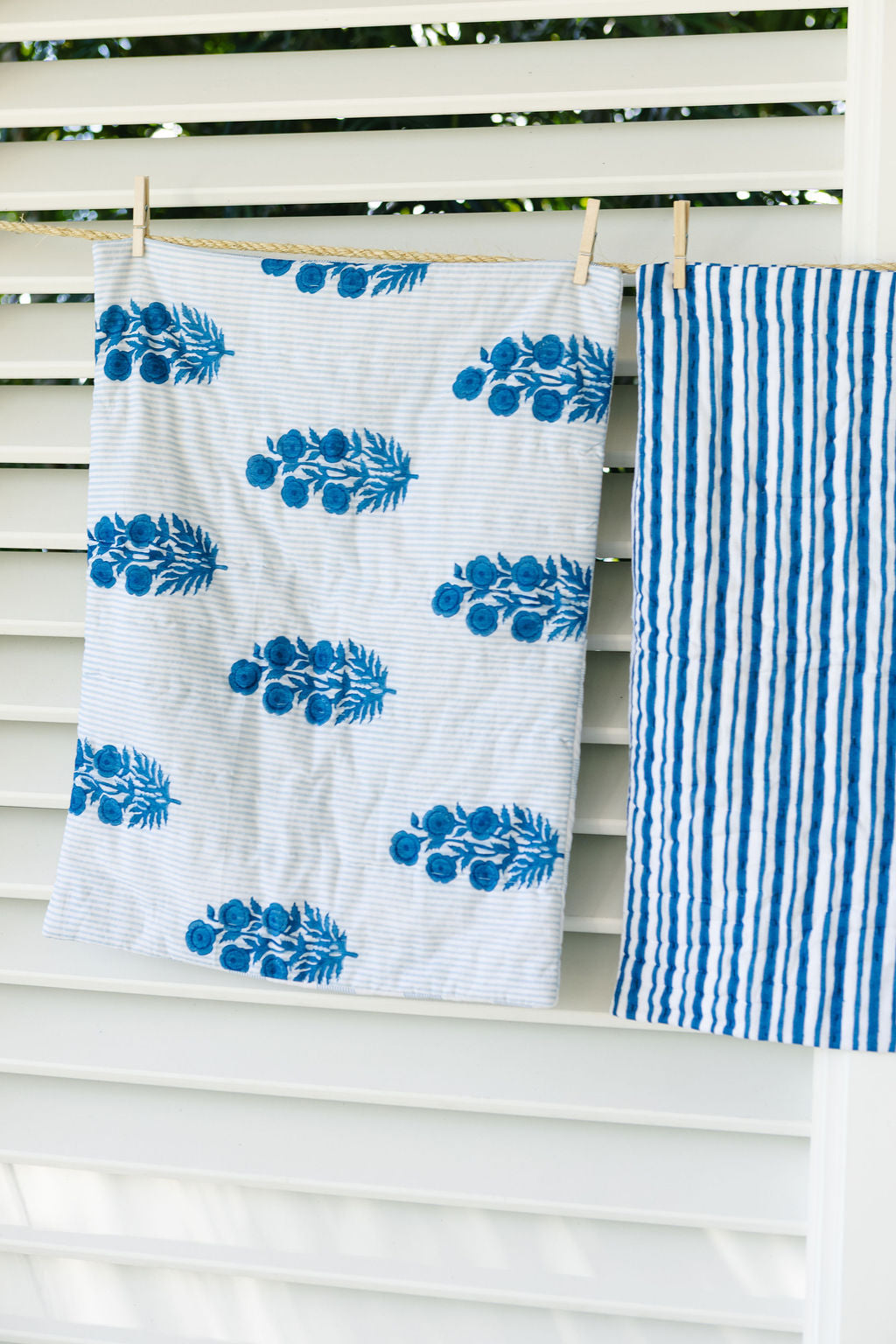 Hand block printed in our exclusive collaboration colors of Directoire Blue & Airy Blue.