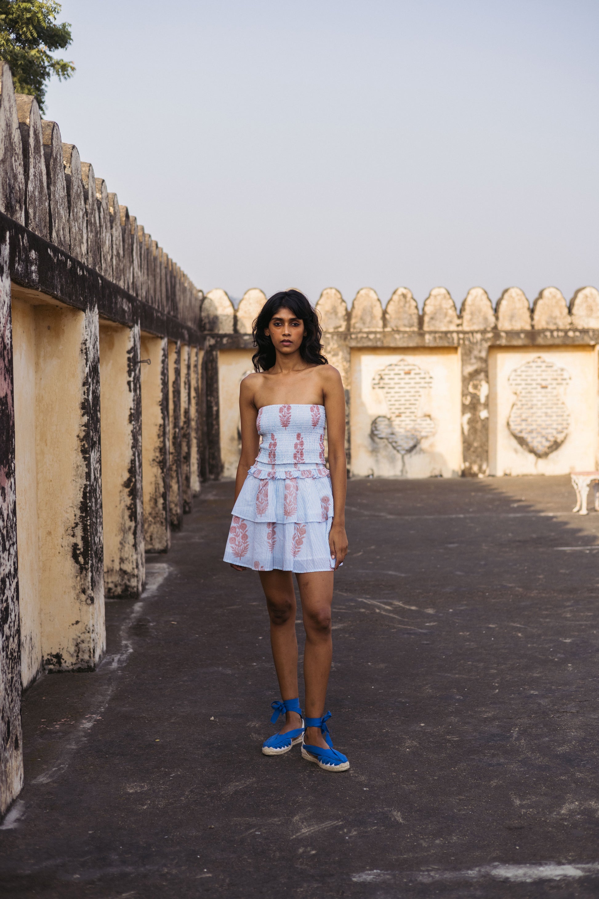 A firty and girly tiered, ruffled mini skirt with a smocked waistline. Made in our lightweight cotton for easy wearing.